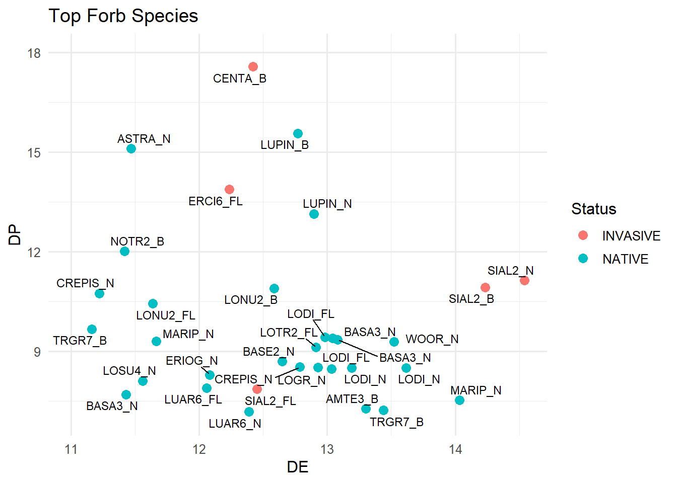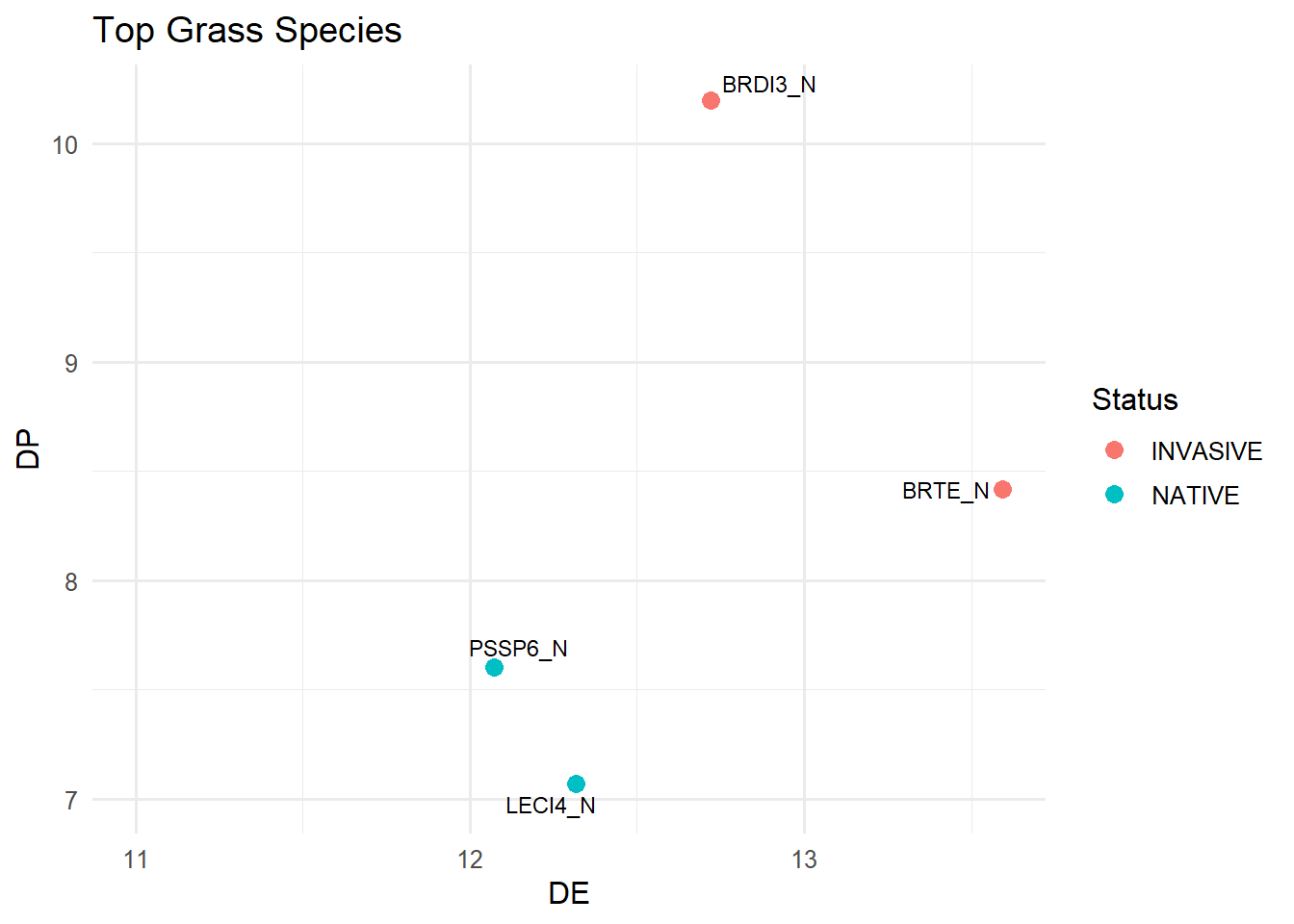 This graph is a zoomed-in look at the previous one, focusing only on the species that landed in the upper right quadrant. As expected, cheatgrass(BRTE) and ripgut brome (BRDI3) came out as the top for grass species with the highest quality metrics, with bluebunch wheatgrass(PSSP6) and basin wildrye (LECI4) not far behind.