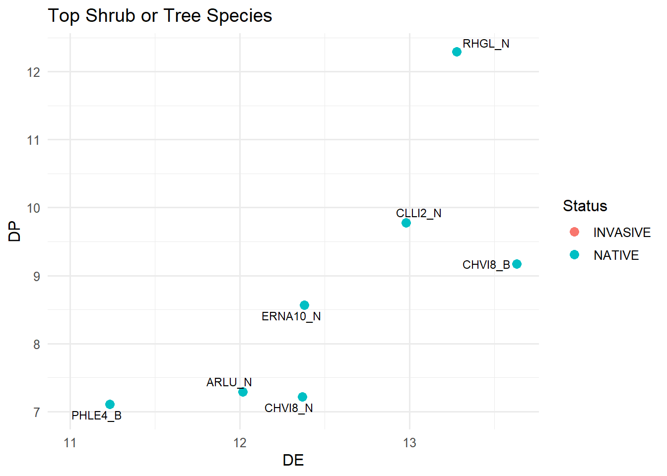 ggplot(shrub, aes(x = DE, y = DP)) +geom_point(aes(color = Status), size =3) +geom_text_repel(aes(label =paste(Spp, Pheno, sep ="_")), size =3) +xlim(11, max(grass$DE) +0.5) +ylim(7, max(grass$DP) +0.5) +labs(title ="Top Shrub or Tree Species",x ="DE",y ="DP",color ="Status" ) +theme_minimal(base_size =12)