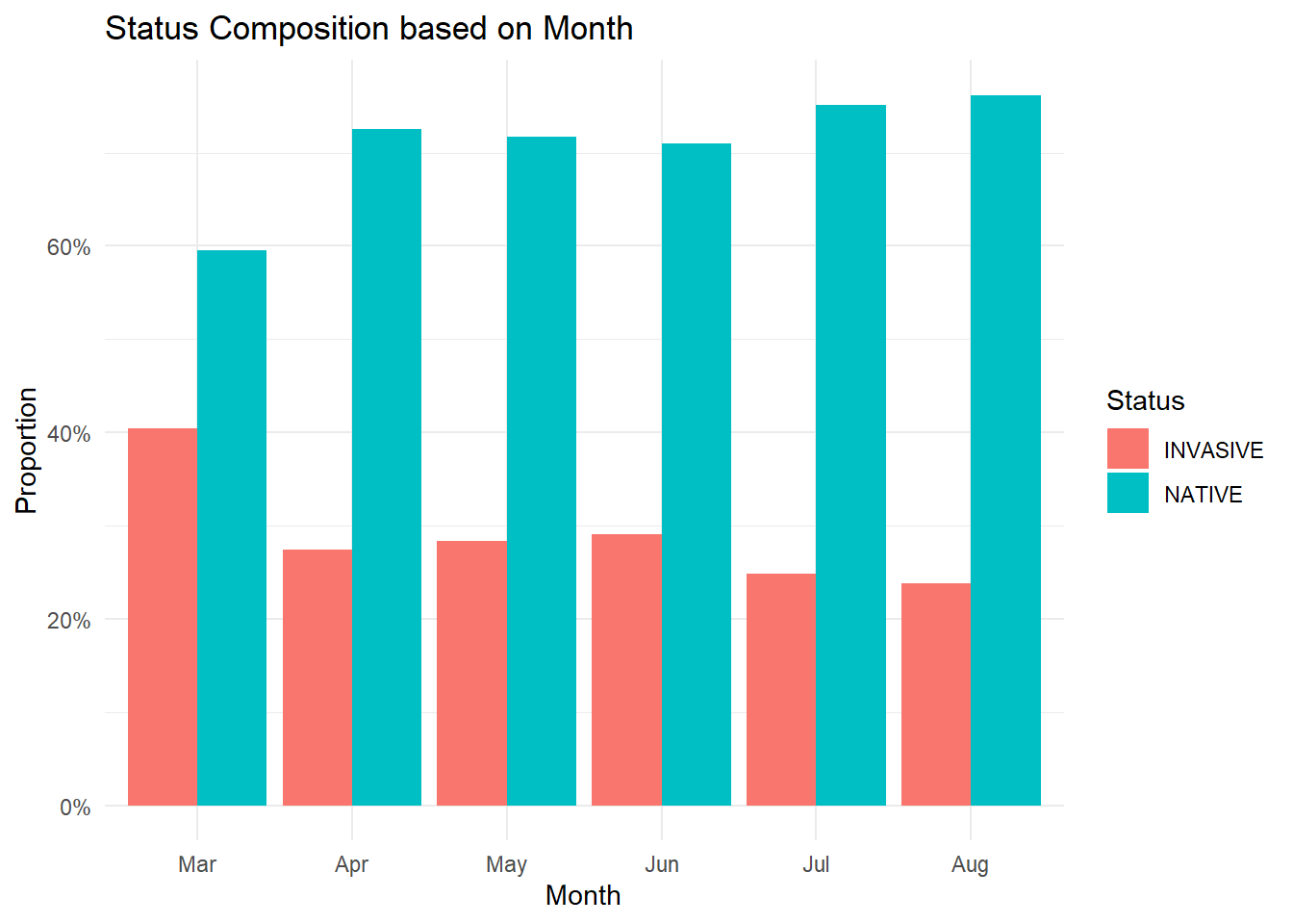 status <- plant %>%select(Spp, Status, FunctionalGroup)df <- comp %>%left_join(status, by ="Spp")df <- df %>%mutate(Pheno =na_if(Status, "NA")) %>%filter(!is.na(Status)) %>%mutate(PVT = dplyr::recode(PVT,`672`="Grassland",`682`="Riparian",`668`="Scabland",`669`="Shrubland",`674`="Intermediate",`660`="Sparse"))df %>%count(Month, Status) %>%group_by(Month) %>%mutate(prop = n /sum(n)) %>%ggplot(aes(x = Month, y = prop, fill = Status)) +geom_col(position ="dodge") +scale_y_continuous(labels = scales::percent) +labs(title ="Status Composition based on Month",x ="Month",y ="Proportion",fill ="Status" ) +theme_minimal()