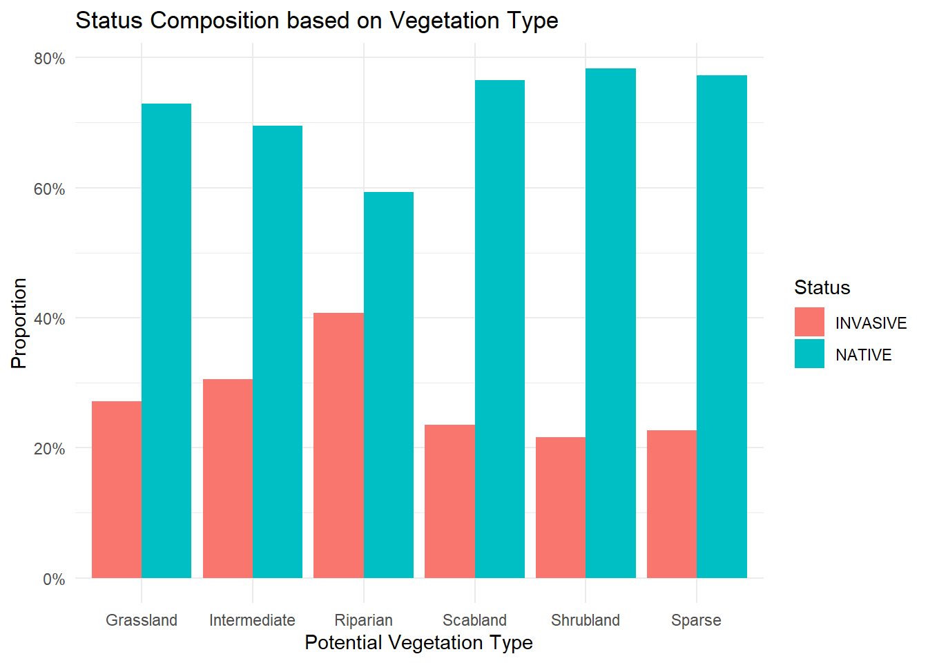 Lastly, I examined how native and non-native species compared across different vegetation communities. The patterns were fairly consistent across communities, although I did observe a slightly higher abundance of non-native species in riparian areas, which I assume is likely due to increased disturbance from animal traffic or erosion.