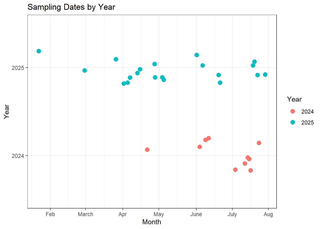 The first graph shows the timing of sampling in both 2024 and 2025, and the second gives a better picture of how the sampling timing overlapped for each vegetation community in both years. Overall, I think we did a good job filling gaps in the smaller vegetation communities, giving us a clearer picture of how phenology timing varies across them.