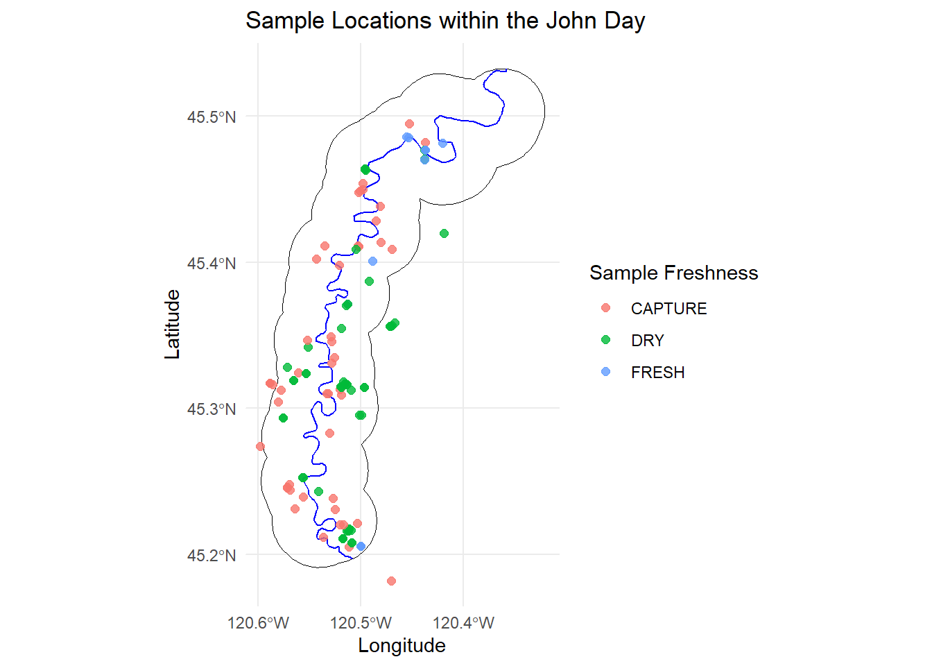 fecal.loc <- fecal %>%filter(!is.na(LAT) &!is.na(LONG)) %>%filter(!ID %in%c("25_045", "25_061", "25_048")) %>%st_as_sf(coords =c("LONG", "LAT"), crs =4326) jd <-st_transform(st_zm(jd), crs =4326)river <-st_transform(st_zm(river), crs =4326)river <-st_intersection(river, jd)ggplot() +geom_sf(data = jd, fill =NA, color ="black", size =0.6) +geom_sf(data = river, color ="blue", size =0.8) +geom_sf(data = fecal.loc, aes(color = QUALITY), size =2, alpha =0.8) +labs(title ="Sample Locations within the John Day",x ="Longitude",y ="Latitude",color ="Sample Freshness" ) +theme_minimal() +theme(legend.position ="right") +scale_x_continuous(breaks =pretty(range(st_coordinates(jd)[,1]), n =3) ) +scale_y_continuous(breaks =pretty(range(st_coordinates(jd)[,2]), n =3) )