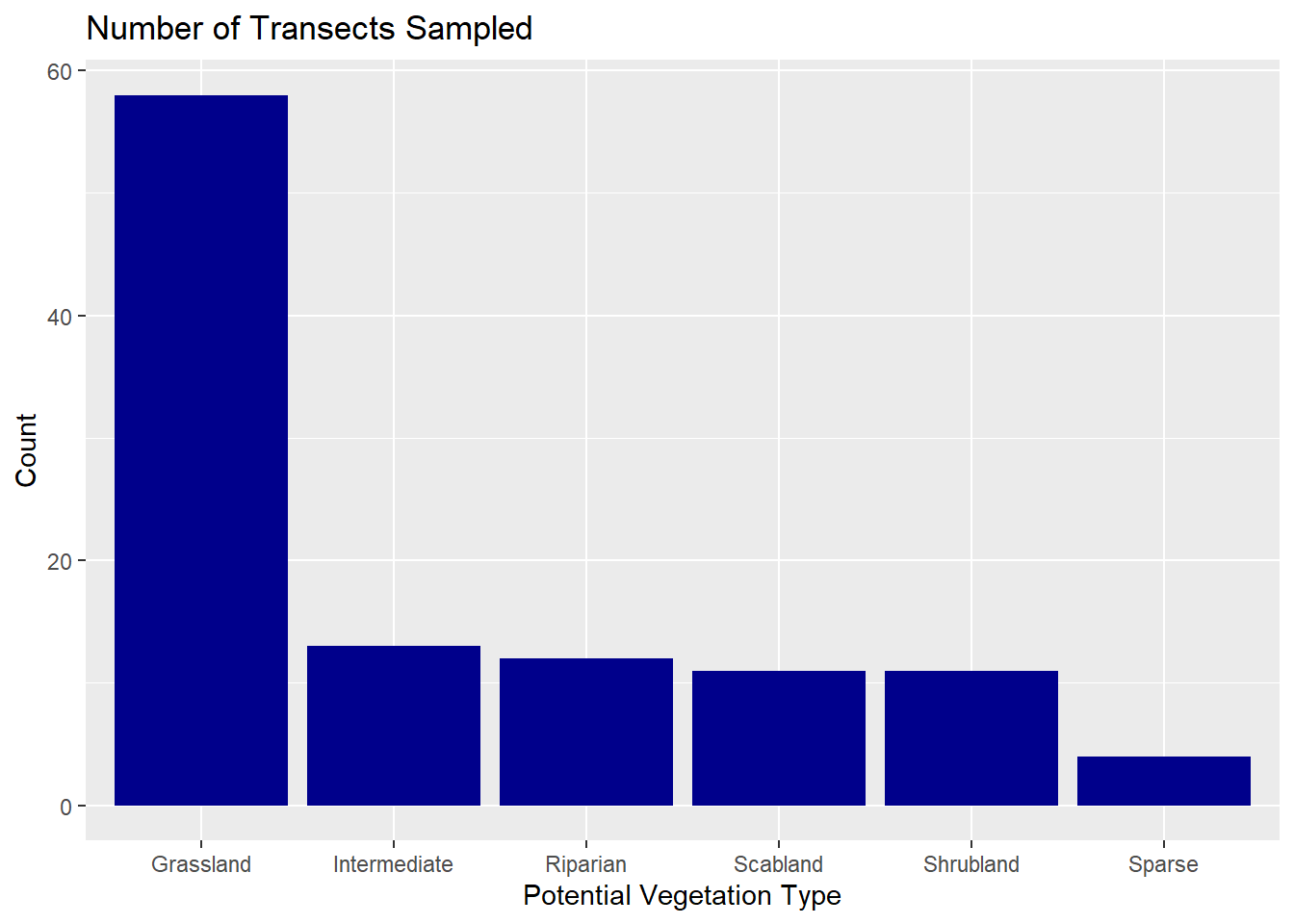Between 2024 and 2025, we sampled 109 transects across six different vegetation communities in the canyon. Most of these were in Grassland (58 transects), with fewer in Intermediate (13), Riparian (12), Scabland (11), Shrubland (11), and Sparse (4). The number of transects in each community reflected how much of the study area that community covered, based on Landfire data. Since Grassland makes up more than 85% of the site, it naturally had the most sampling, while the other communities only covered about 1–5% each. As you all know, there are plenty of rocky(sparse) areas that sheep often use, but because they were tough to get to and didn’t usually have much plant diversity, we ended up sampling fewer transects within these communities. Still, I think the sampling we did was enough to capture any variation in that community.
