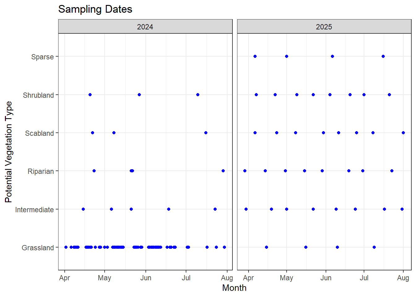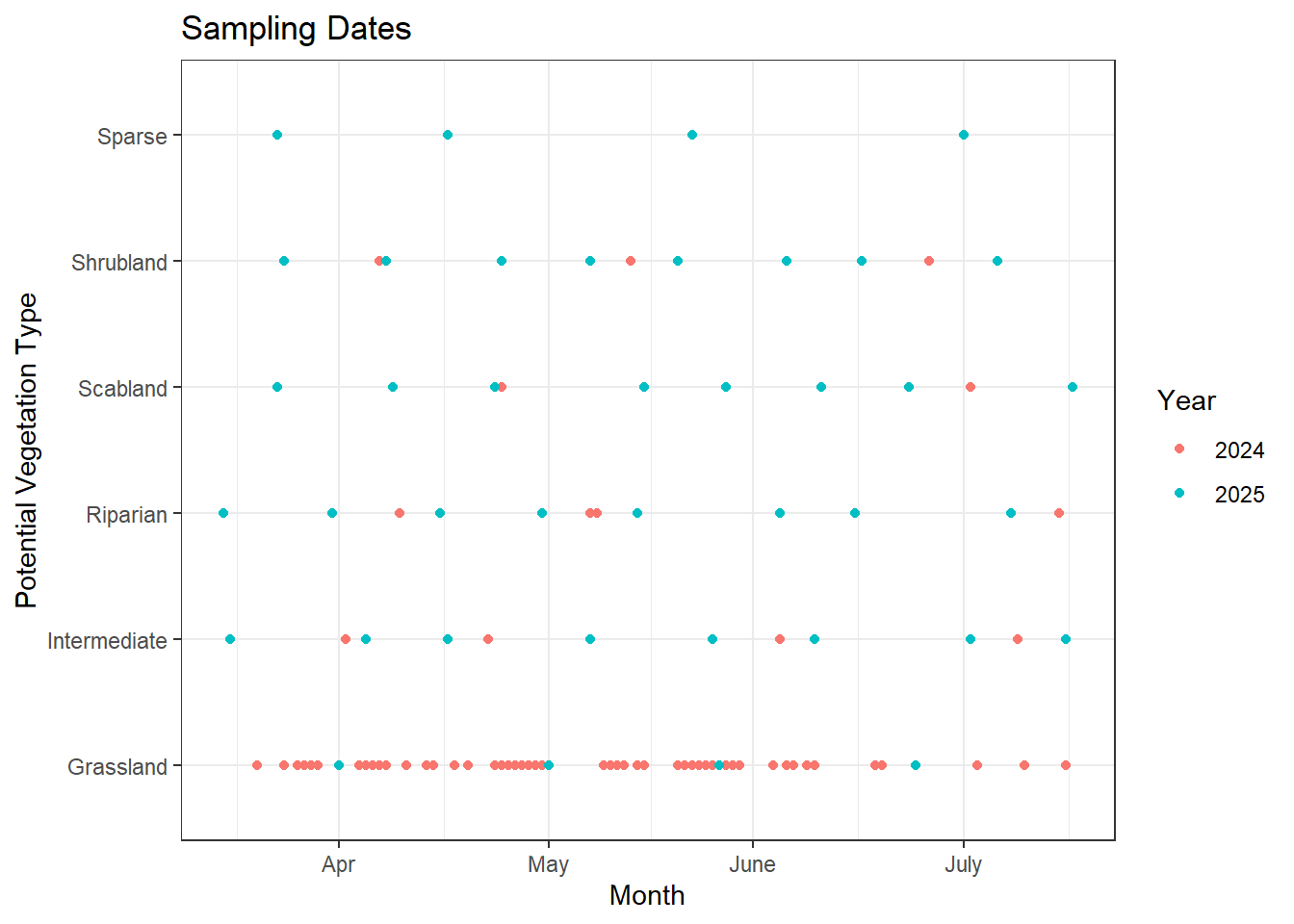 In our first year, we focused heavily on the grassland community and sampled transects more strictly in proportion to the area each vegetation community covered. Grassland was sampled two to three times a week, with fewer visits to the other communities, which didn’t give us much coverage outside grassland. In the second year, we shifted more effort toward the other vegetation communities to better capture their phenology timing.