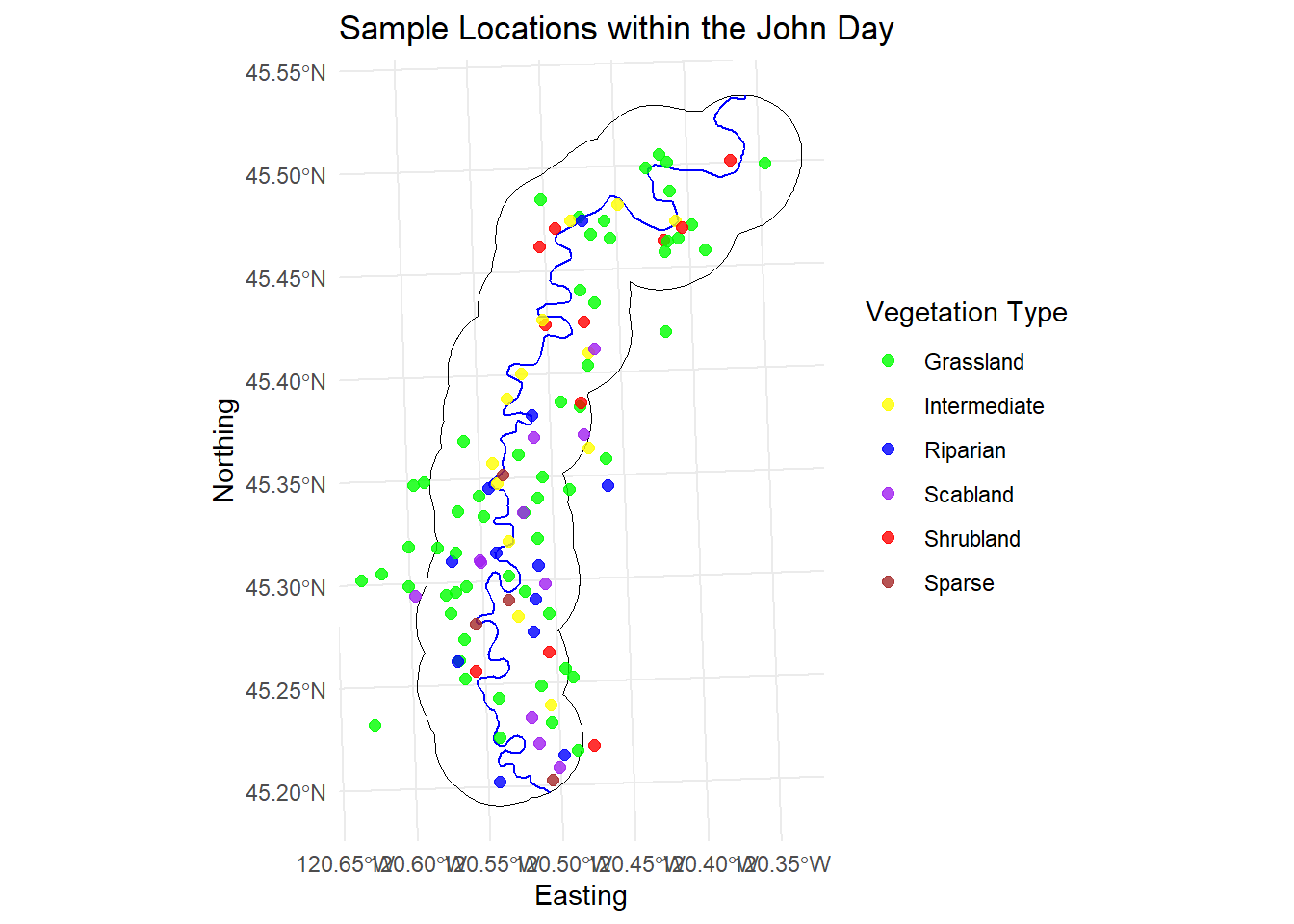 library(ggmap)river <-st_read("C:/Users/Alexis Means/Documents/Project/JohnDayRiver_shp/JohnDayRiver.shp",quiet =TRUE)jd <-st_read("C:/Users/Alexis Means/Documents/Project/Nutrition Sampling/2025_GRTS/25_StudyArea/25_LJD_StudyArea_all.shp",quiet =TRUE)jd <-st_transform(st_zm(jd), crs =32610)river <-st_transform(st_zm(river), crs =32610)river <-st_intersection(river, jd)ggplot() +geom_sf(data = jd, fill =NA, color ="black", size =0.6) +geom_sf(data = river, color ="blue", size =0.8) +geom_point(data = transect,aes(x = easting, y = northing, color = PVT),size =2,alpha =0.8 ) +scale_color_manual(values =c("Grassland"="green","Riparian"="blue","Sparse"="brown","Intermediate"="yellow","Scabland"="purple","Shrubland"="red" )) +labs(title ="Sample Locations within the John Day",x ="Easting",y ="Northing",color ="Vegetation Type" ) +theme_minimal() +theme(legend.position ="right")